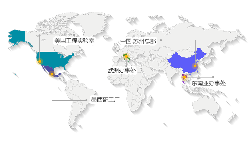 公司在中国苏州和墨西哥克雷塔罗各设有制造基地;并在美国加州和意大利威尼斯、泰国曼谷各设有服务点;拥有完备的销售网络和强大的服务体系。